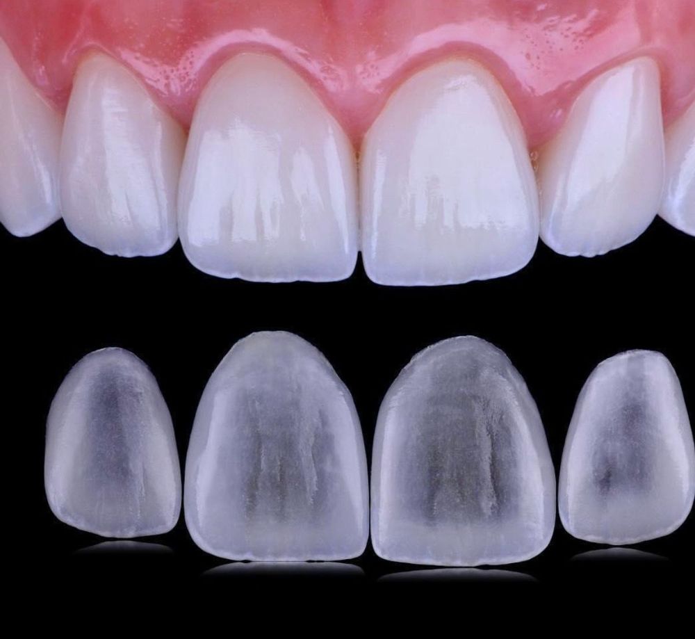 - Porcelana, disilicato o resina compuesta, para corregir color, forma o posición de los dientes anteriores.